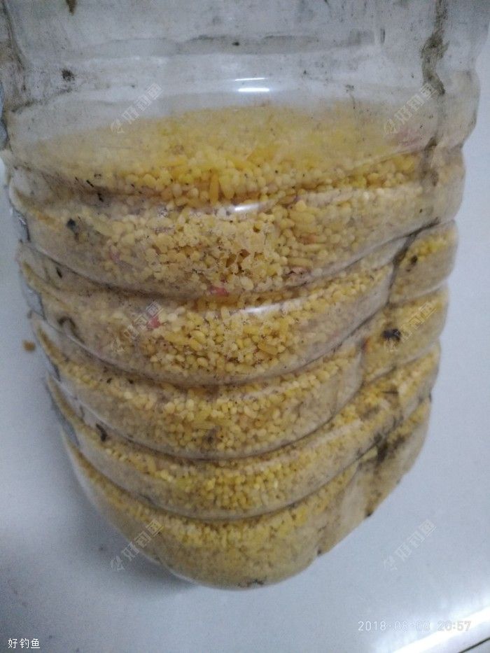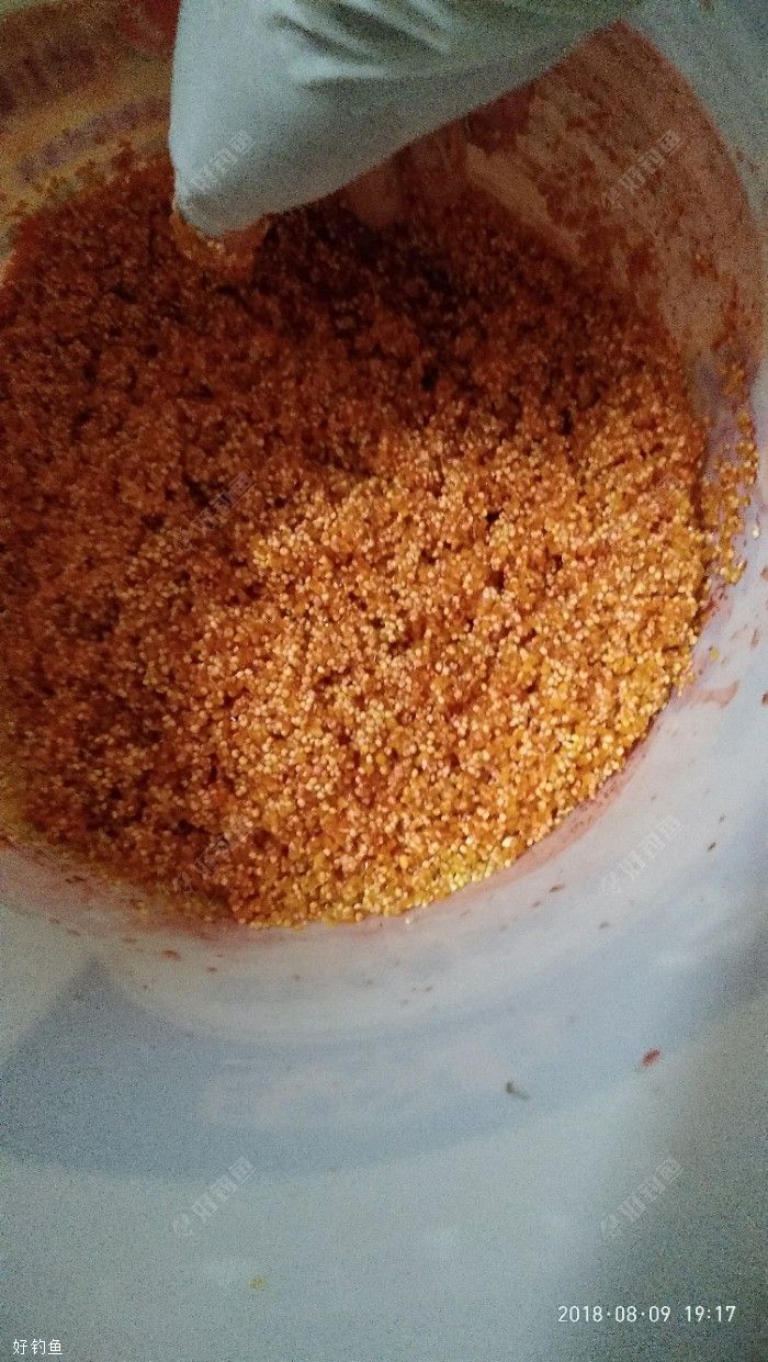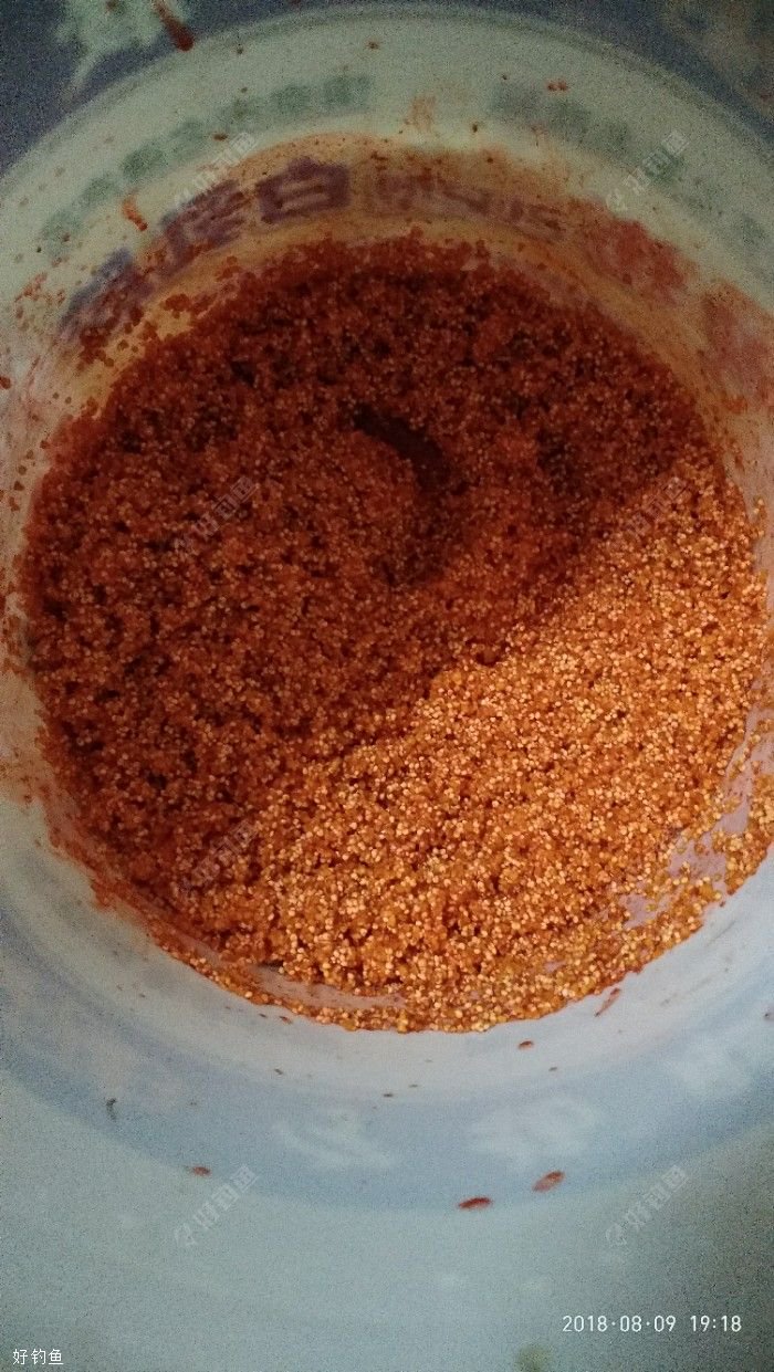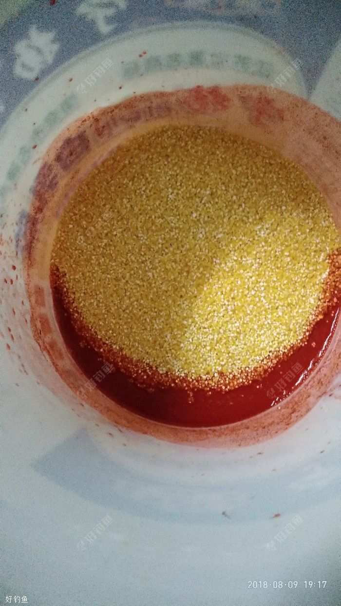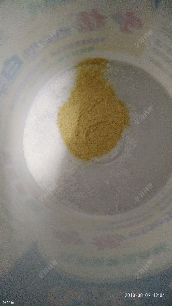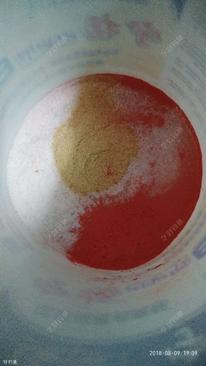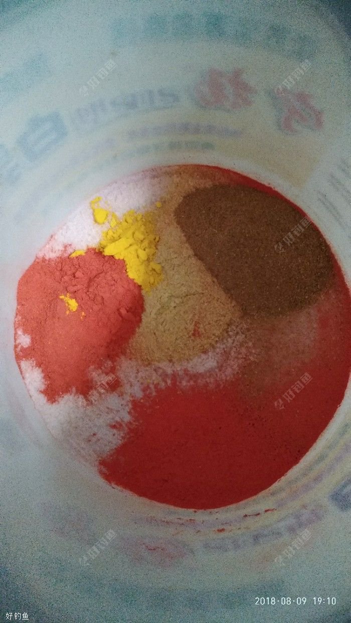 碎玉米+小米三斤左右的量,牛逼红鲫水剂300毫升一瓶,牛逼红鲫粉剂3袋麝香粉3袋,红虫粉40克一袋,鱼味精30克一袋,白酒五六两,红鲫粉剂里面有蜂蜜水我还加了一些白塘。配料就这些了,然后就开始倒入各种粉剂。混合搅拌后开始倒入牛逼鲫水剂,再用酒把瓶子冲干净最后加白酒一起搅拌,不能有沉淀物。