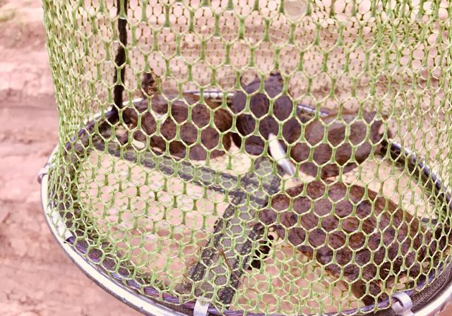 用火腿肠当钓饵入水后,我端起面桶正吃面的光景瞅了一眼浮漂却没看见浮漂,我定眼一看的确水面上没有浮漂的影子,我还以为是小杂鱼闹钩给拉黑漂了,索性提一下竿看看什么情况,结果一扬竿居然钓上了一只巴掌大的背上是花点儿、肚皮金黄的野生甲鱼!这对我来说太新鲜了,火腿肠居然钓上了甲鱼。我钓鱼惯用无倒刺钩,手提着渔线把甲鱼在鱼护口的档线(绷了一根粗渔线当做档针)上轻轻一勾,甲鱼就落入了泡在水中的鱼护里。我赶紧又掐了两块儿火腿肠挂钩抛入钓点,这次是瞪大眼睛看着浮漂的动静。没过多长时间,浮漂先是剧烈了抖动了两下然后就一个顿口不动了,我赶紧扬竿,又是一只巴掌大的野生甲鱼!