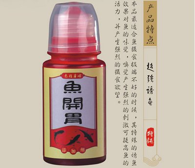 市面上的鱼开胃一般多呈红色液体,粘稠状及粉末状;乳香味道中带一点酸味。在初春水温较低的季节,对付鲫、鲤、草等淡水鱼有着不错的诱鱼效果。鱼开胃内含天然酵素成分,在水温较低,鱼儿摄食欲望不强的时候,作为添加剂添加到饵料中,能够提高饵料的适口性,增加鱼饵对鱼类的吸引力。