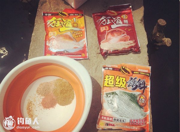 粉碎超诱100毫升、虾粉20毫升、4#鲫30毫升,雪花粉50毫升,腥香型 (搓饵)。饵水比例:1:0.9。