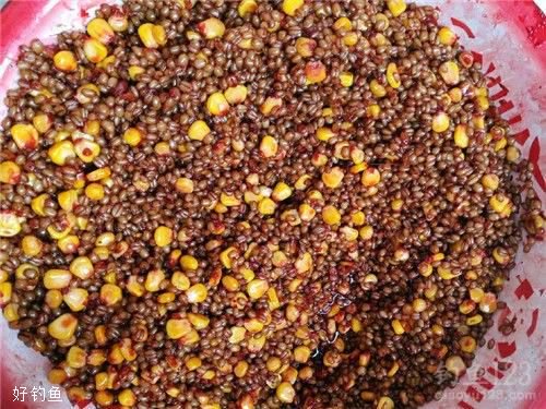 2.制饵流程:玉米粒同样先要水泡、水煮,注意不要煮烂。晾干后倒入罐中,与曲酒、蜂蜜进行充分混合。一般来说,要发酵三天到一周左右,以便让味道更深入。制好之后,挑颗粒饱满的穿钩作钓,注意穿好后要往复活动一下米粒,不要死卡在钩上。钩尖适当微露,然后就可以钓鱼了。