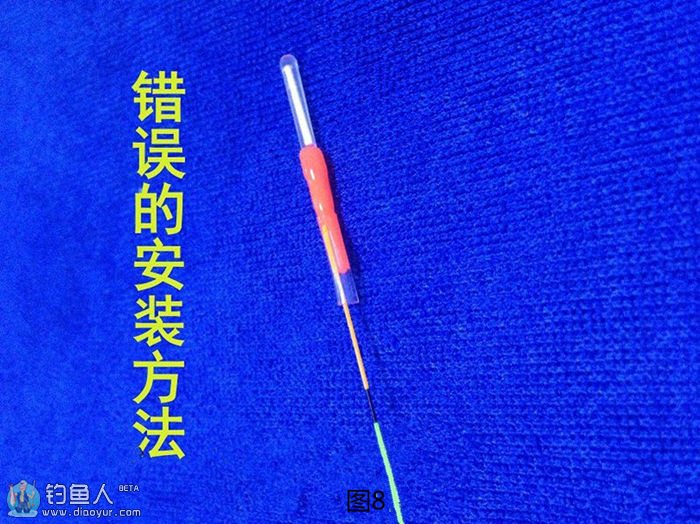 为什么说这样是错的呢?因为夜光棒在空气中有重力,它的重力越大,调漂时需要剪掉的铅量就越大,也就是说这样安装夜光棒使它自身更重了。调漂时要剪掉更多铅皮才能使浮漂将它顶出水面,它严重影响了浮漂的吃铅量。大家都知道等体积的浮漂吃铅量越大越灵敏,反之越迟钝。