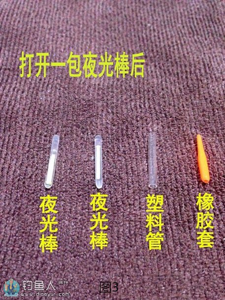 小提示1:夜光棒是有大小号之分的,从目前国内见到的大致分别是:2.2#、2.9#、3.5#、4.5#。号越大棒体越大,光点越大,视距越远,看得越清晰,当然也就越重从而影响浮漂的灵敏度。我钓鱼时通常选择2.2#的夜光棒,这样相对灵敏些,不管长杆短杆都能看得清。2.2#夜光棒不太好卖到,大家用点心吧;