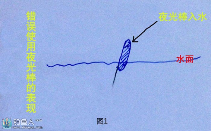 首先说什么叫“永远”,这指的是从调漂到开始钓鱼夜光棒都必须离开水面有一定的距离。例如:您调8目,如果您把夜光棒放在1目的位置那么也可以称作调棒下7目。也就是说这种调漂是用浮漂的浮力顶起夜光棒的重力,这时夜光棒离水面有7目的距离。例如:您调好了8目,钓3目即棒下两目。也就是说夜光棒离着水面有两目的距离。这样的话您就做到了“夜光棒永远不挨到水”。请看错误使用夜光棒钓鱼的做法(如图1)