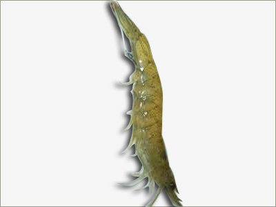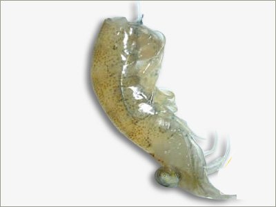 所谓整虾,系指没有去钳、头、尾、壳的虾。这种挂饵法,将钩弯方向调整到与虾体弯方向一致,钩尖穿入虾口并向虾腔内深人,使钩条尽量多地埋入虾体内,最后将钩尖从虾体内横穿出体外,露出钩尖。这种挂饵法适合钓大鱼和吃食凶猛的鱼。