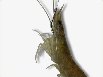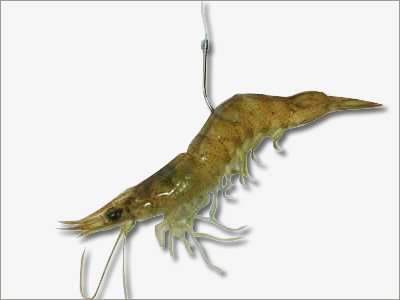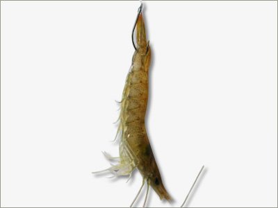 用小活虾装饵,根据虾体大小选用合适钓钩,从胸部穿人或从尾部穿入均可,但必须露出钩尖,此种饵多用于钓较大的鲶鱼、鲤鱼和黑鱼等。