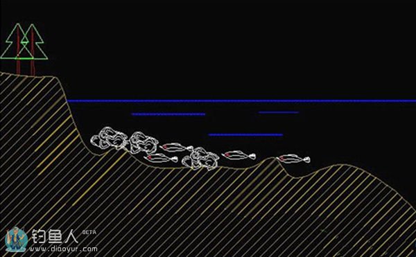 这种地型,是用VlB的好标点,塑料和铁板VlB都行,尾部带旋转片的也行。为了慢能出泳姿,挂孔有选择的话,请挂最后的孔,手法和亮片差不多,慢,再慢…
