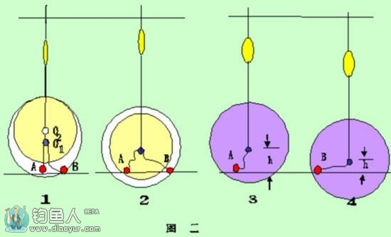 是台钓钓组钓底脑线弯曲时的示意图,图中A、B饵钩大小相同,钩的脑线长度相同,铅坠离水底高度h不同。在这两个钓组中,它们的灵敏度是不同的:当鱼等距离水平横拉A饵钩时,漂尖先不动,后能位移稍大距离,当鱼等距离水平横拉B饵钩时,漂尖先不动,后能位移稍小距离;当鱼等距离上拉A饵钩时,进入盲区范围虽然大,但盲区的下端范围小,当鱼等距离上拉B饵钩时,进入盲区范围虽然小,但盲区的下端大。综合看鱼的这三种吃饵动作,还是A饵钩的灵敏度高些。