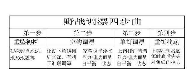 先说《野战调 漂四步曲》——重坠初探……空钩调漂……单饵调漂……重饵找底。即两个平衡、两个找底,一个极简单的问题不要想象得太复杂。