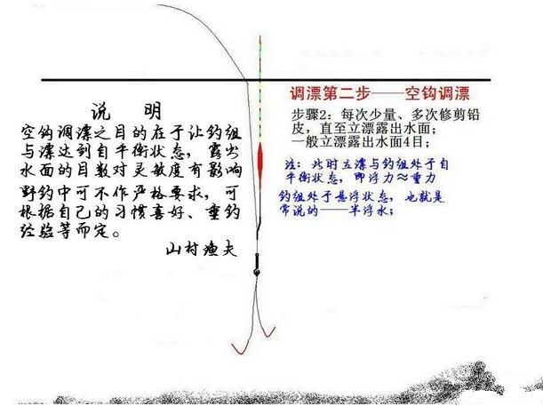 渔夫注:调漂本是一个极其简单的水体静力学问题、即浮力=重力的问题,新手一定要对自己有信心,只要按照步骤操作、不要担心钓组在水底的状态不正确。多实践几次后自会孰能生巧、融会贯通,更可以通过变更目数来调灵、调钝……