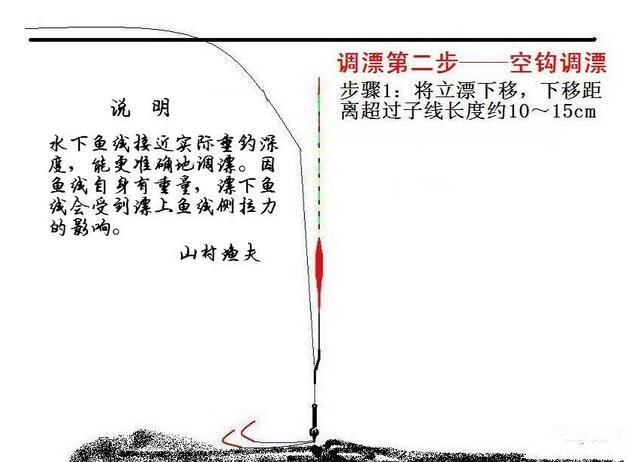 再在下钩挂上比正常钓饵大得多的饵团,通过上移立漂至立漂露出水面2目为止,至此调漂工作结束——理论上说鱼钩的垂钓状态绝对是一颗悬、一颗触底,即使下钩换上正常大小的饵团或无饵、其状态不变。