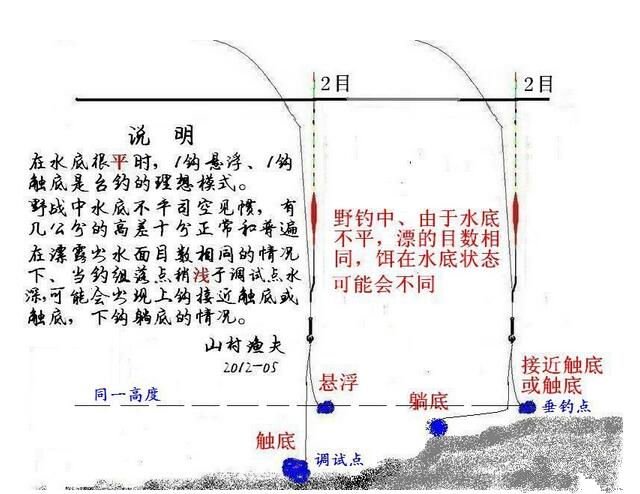 在水底不平的野钓中,如果抛竿落点略深于调试点,立漂露出水面目数会少于调试的目数、甚至淹没,因为漂会受到两个饵团的重力作用——这能通过漂位直观地看出而能轻易处理,如多数情况下是将钓组向身边拉近一点让立漂到钓目就可。