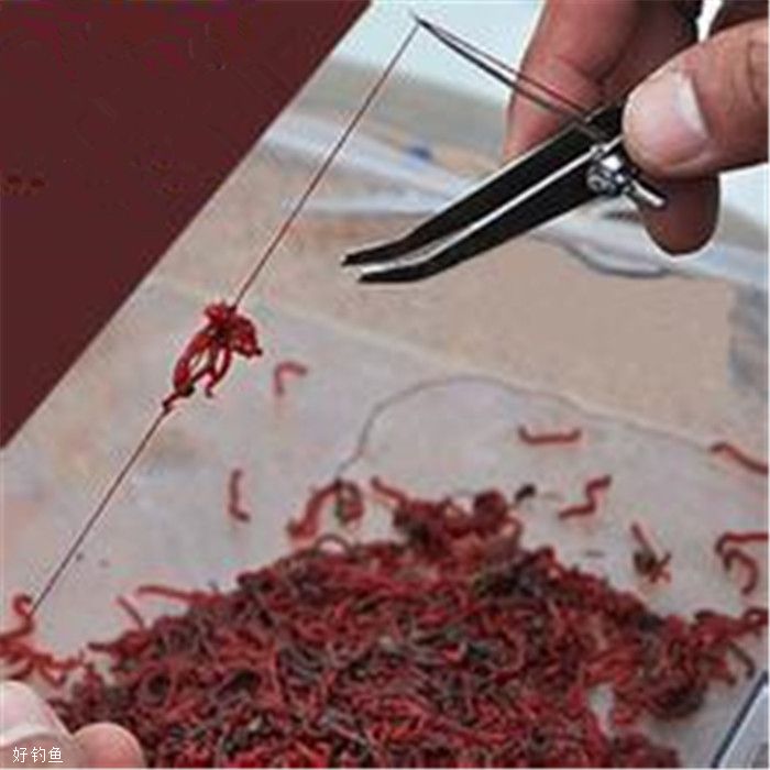 准备一个自行车的气门芯,用剪刀横着剪下一个小胶圈,将小胶圈拉开,把适量的红虫放进胶圈里面,然后这款红虫饵就做好了。