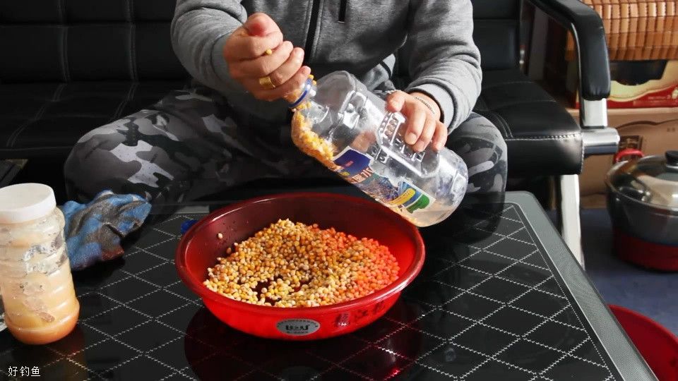 先说一下咱用到的东西,主饵老玉米,然后配料有高度曲酒和蜂蜜,工具准备好饵盆、饵瓶、电子秤和蒸锅。