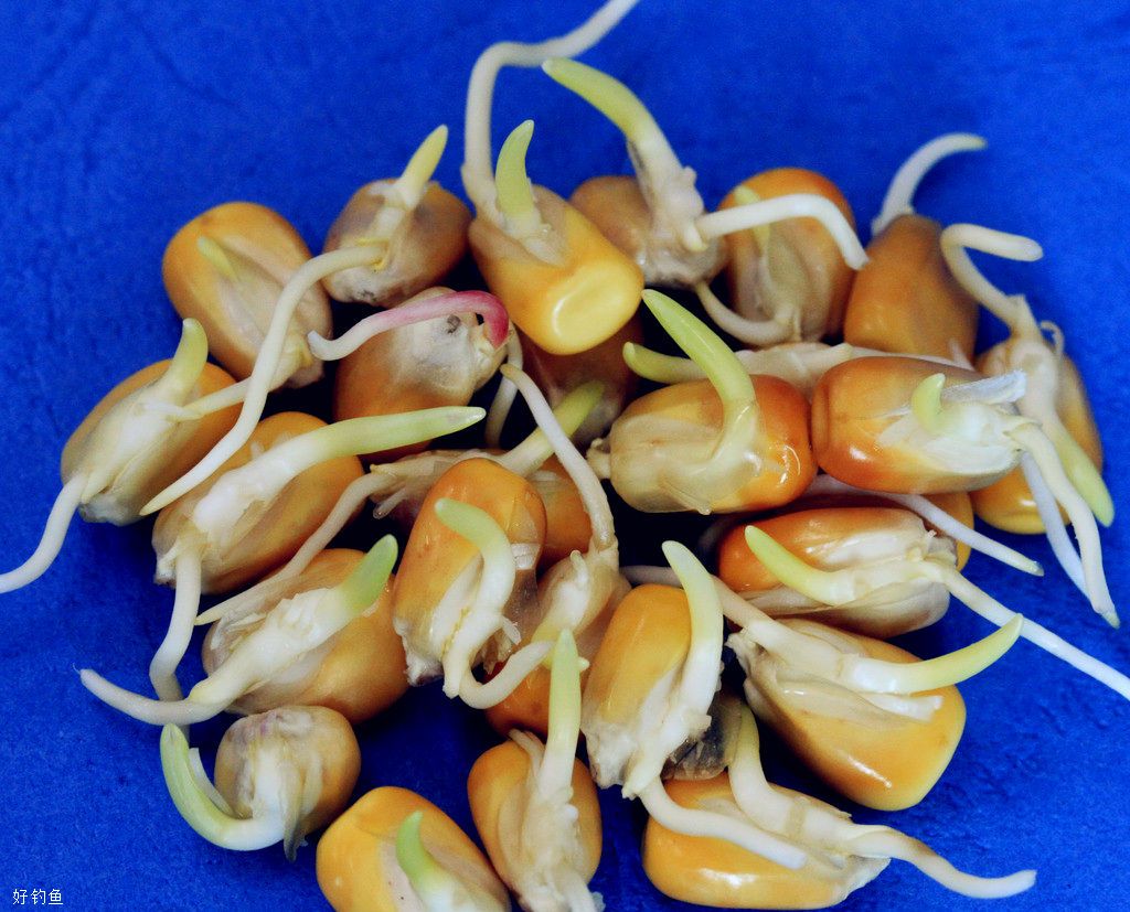 这款饵料有两个关键点,第一是丁香药酒的泡制,这个需要的时间较长,但丁香药酒对我们钓鱼人来说用途非常多,大家可以提前制备;第二是发芽玉米粒的制作,这个过程模拟了玉米粒胚胎发育的过程,玉米粒先用40度左右的温水浸泡,然后用湿毛巾盖住玉米粒,整个过程中一定要保证毛巾的湿度,其实咱们常见的豆芽就是这样做出来的。泡制的时候药酒适当多一些,让玉米粒充分吸收到药酒成分。