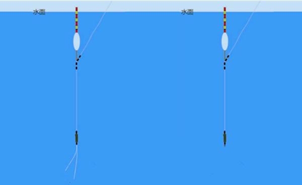 但是野钓的话差不多就行,所以无子线调漂,挂子线后钓这个调目也是可以的。比如下图,都可以钓2目,状态基本是一直的。重量上仅仅是少了两根不挂钩的子线,这个重量没多少,钓鲤鱼不太讲究这些。铅坠到底或者无钩调漂,都能保证就算没饵料了,双钩还是在水底的。