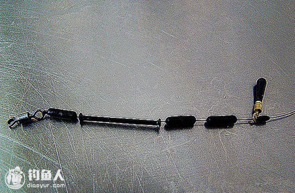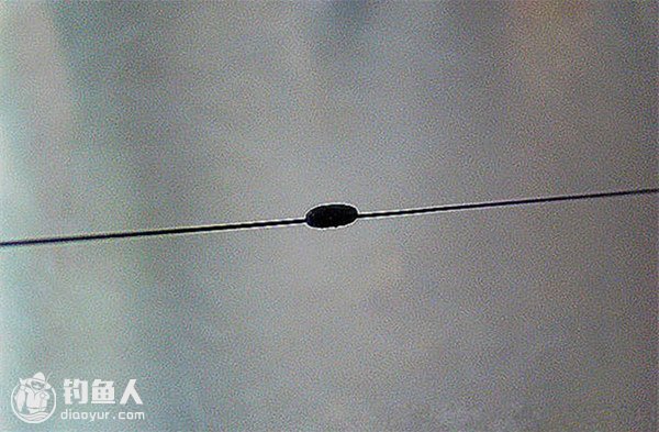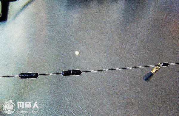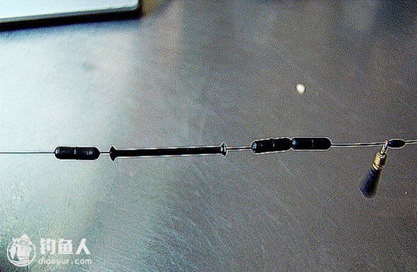 先穿一颗小太空豆。这颗太空豆起漂座上滑定位作用,控制浮漂上滑距离,用它调节施钓泳层。这颗太空豆要能够顺利穿过导线环才行。