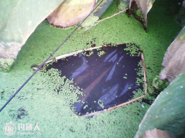 ②因浮萍密度大,水底缺氧,鱼在水皮,经过水面留空后,氧气充足,最下诱饵,鱼会很快地下底入窝,我们就开始作底钓了。