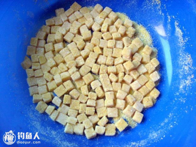 取玉米粉800克、白糖100克,加入适量的开水,搅拌成糊状,取锅一口,放入清水,锅内放上蒸菗,垫上纱布,将搅拌好的玉米粉放在纱布上摊成 1.5公分厚,蒸八成熟,蒸熟后取出到入盆内,加入蜂蜜,乘热反复搓揉上劲,然后将玉米面团放在台子上压成1公分厚,用刀切成1公分方的小块,撒上多余的玉米粉,用马夹袋装好,再用口喷上少量的曲酒密封,一款纯天然玉米香味浓郁的钓饵就完成了。