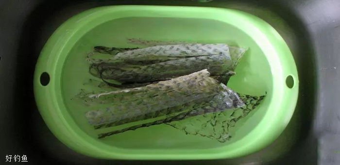 钓饵:将鱼皮(最好是2~3斤除了鳞的草、鲤鱼皮)连同绑好鱼钩的线一起编成辫子形状备用,鱼皮是起到积蓄诱饵的作用,鱼皮辫可反复使用,用后经水冲洗一下包好放冰箱冰冻,用时取出泡冷水解冻,使鱼皮柔软。