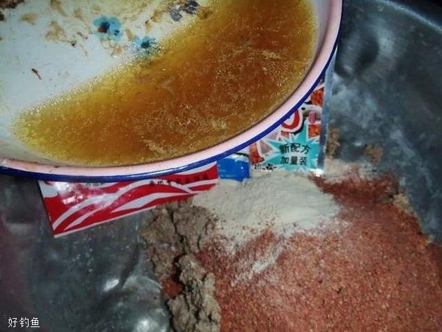 接下来就是整个的配置饵料过程,先准备鱼肉酱一团;拉丝粉一袋;商品饵一袋;赤尾青一袋;适量的面粉。大家直接将这些材料都添加到盆里,把之前蒸鱼出来的汤汁给倒进去,然后再进行搅拌均匀。如果饵料太干的话,那就直接加水进行搅拌即可;