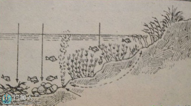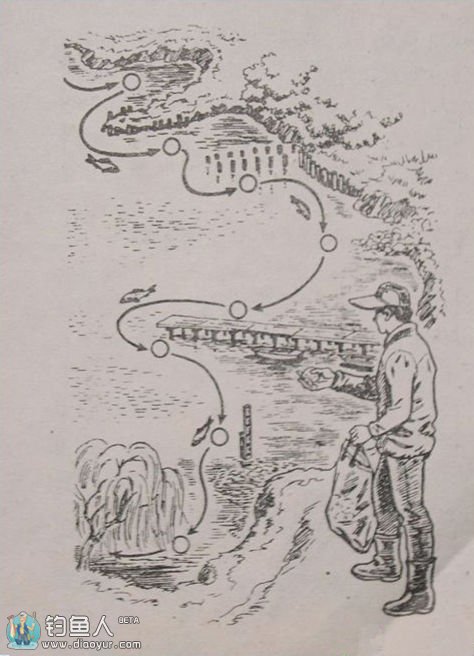 这是一张很直观地描述人工造鱼路的图。对于喜欢野外多点跑钓的钓友有指导意义!其实此图中带“O”的点本身就很有可能是“鱼窝”!即使不造人工鱼路,箭头所划出的线路也很有可能是天然鱼路!