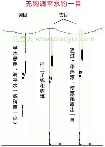 无钩,半水悬浮状态,调平水(漂尾刚平水,或稍露出一点)。然后,挂上子线和钩饵,通过上移浮漂,使漂尾露出1目。还可以调1钓2,调1钓3等。