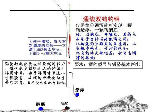 该钓组的特点:不需复杂的调漂就可轻松实现1钩悬浮、1钩躺底的垂钓模式,且不受水底地形、地貌的影响——上钩始终会处于悬浮状态。
