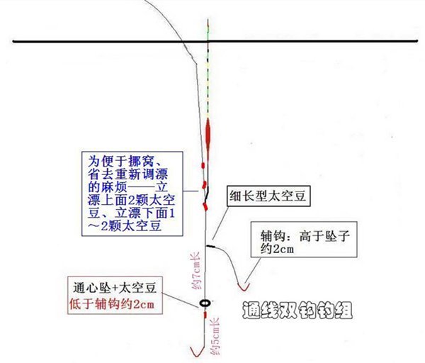 所谓的通线双钩就是在传统钓组的坠子上面再拴颗辅钩、用立漂代替七星漂,辅钩的高度应高于坠子约2cm,其特点是鉴于传统钓与台钓之间;比较适合不喜欢弄台钓的老同志玩,更可配置于带车盘的手车竿上。