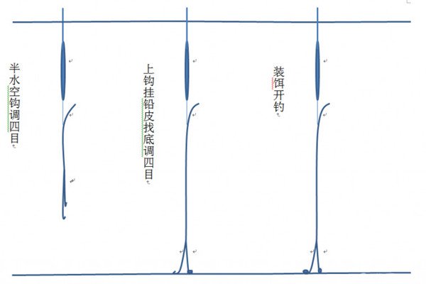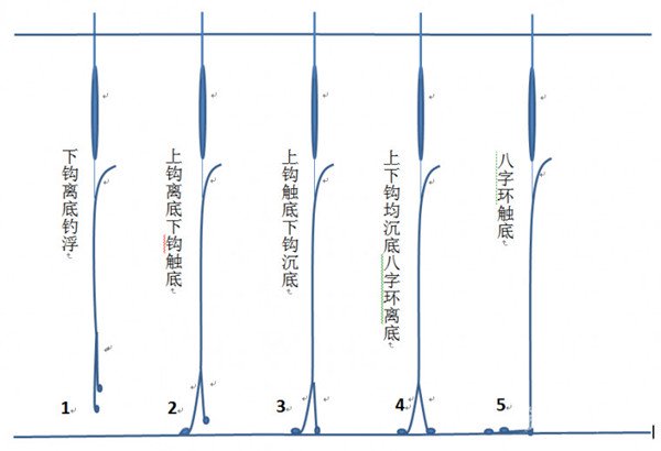 台钓调漂目的是为了在应对不同鱼种鱼情时,控制双钩在水底的状态,使鱼吃鱼饵时快速反应给浮漂信号,钓者提竿能牢靠中鱼。不讲怎样调为灵何为顿,讲一下双钩挂饵后在水底大致有以下几种状态: