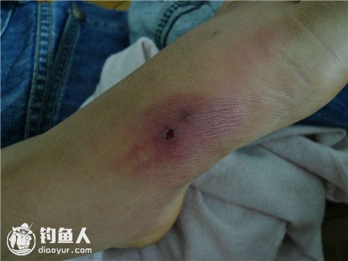 在夏天野钓的时候,经常出现钓友被蛇咬伤的情况。如果我们被蛇咬伤,首先要注意观察伤口上的牙印。如果不痛,不出鲜红血,那便是毒蛇所咬(如果伤口发紫,流出黑血,应当即时报警求救,不要用微信、微博自拍,生命要紧)。