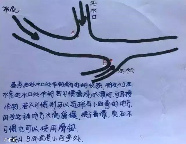 大家在水库选点时也要注意不要选择黑色区域作钓,因为黑色区域在正常时是水流的冲击区域,涨水时冲击力更强,水流更迅猛,因为鱼儿生性胆小,自然不会在此处停留,大家可以选择红色区域作钓。