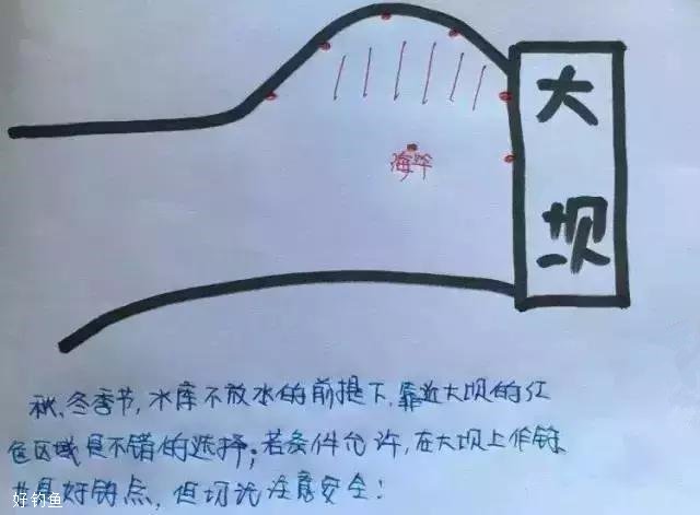 秋冬季节,水库不放水的前提下,靠近大坝的红色区域是不错的选择;若条件允许,在大坝上作钓,也是好钓点,但切记注意安全。
