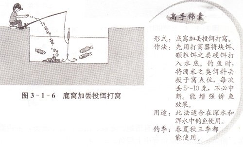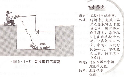 沉底窝饵加丢投饵打窝,即在先打好沉底窝之后,再用手不断 加投酒米、颗粒饵之类沉底硬饵,主要用于浑水钓鱼,提高饵料的 诱鱼效果。