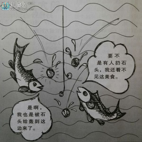 2014年3月15日,天气晴,我与钓友王华在一个大水库的沟汊里野钓, 钓位水深1米左右。我两面对面坐着,上半天全是白条咬钩,每人各钓了十几尾大白条。中年1点以后水面起风了,鱼儿基本停口,我看到左边八九米远的浅水处不 到一尺深,一大群白条聚在那里晒太阳。艳阳下我俩都不想再挪窝了,于是想出一个主意,试着往浅水处扔小石头。让人没想到的是,鱼儿很听话,我们每扔一块石 头后就各钓上—条白条,不扔石头立漂就纹丝不动。