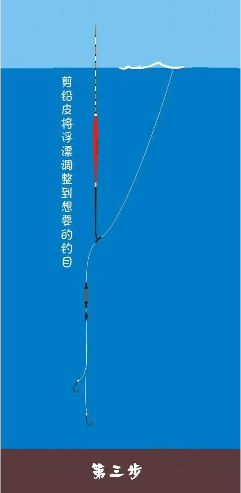 第三步开始剪铅皮,直到浮漂露出水平面四到五目(露几目就是所胃的调几目)。