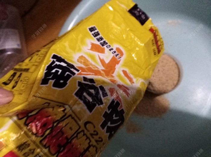 2. 先拿个脸盆作拌饵料之用。为了让钓友看清楚就用个量怀吧。然后,按照顺序分别添置倒入盆中。