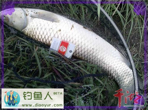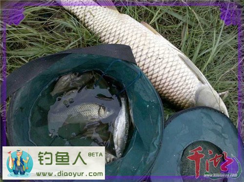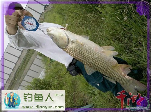 过程:先搓大饵抽窝三十余竿,后搓小饵底钓,三个小时内只上了一尾小鲫鱼和一尾相对超级大白条。再后改拉饵,首竿是在不经意间见浮漂微微一顿,就手提竿却中鱼。一开始感觉是有点份量,估计是小鲤鱼(以前在此钓场经常遇到鲤鱼) 来着,害怕搅了窝子,遂稍微运力举竿牵线,慢慢引鱼远离窝点,水中物也很配合,随着钓线的牵引而离开窝点十余米。微力引鱼出水面,才发现是一尾大草。这时 估计大草也发现了我在岸上的身影,一个大摆尾,强力向水库中心冲刺。我看到大物后,想到的是细线小钩,遇到大物后这样的线组肯定得完蛋。说时迟那时快,顺 着大鱼方向放低竿尖,同时赶紧松开绕线轮拽力开关,放大绕线轮泄力,让大物与我的绕线轮拔河,再凭感觉慢慢调紧拽力器……溜鱼半小时,最后那大物肚皮朝 天,遂用大抄网轻松抄鱼上岸。大草入护后,我又回到钓位,继续开钓。这时感觉窝中鱼明显增多,上鱼频率渐高,基本没有停口。至下午近5点收竿。最后收获 10余斤,其中:大草9斤半、鲫鱼数十尾、大都是两把左右重,一尾大白条鱼有2两重,也挺稀罕的!真是夏季雨后水库爽钓鱼啊~~水库钓点风景不错