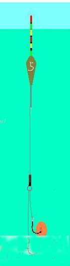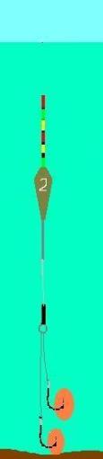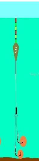 如果我们将浮漂上调至露出一到两目时,由于水线的延长和浮漂部分出水使其对钓组浮力的减弱,此时钩饵在水就会出现双饵触底的状态。如图4