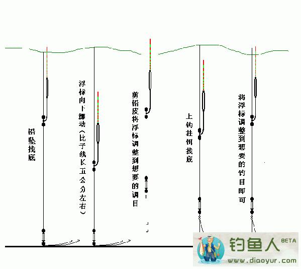 我用下图来简单的说明一下台钓的调漂过程吧,先是找底(水的深度),当然用重于浮漂浮力的铅坠了,刚开始可能你会看到漂完全沉入水中这就说明坠已经到底了。移动漂(向上)。。直到漂露出水面一目为止。